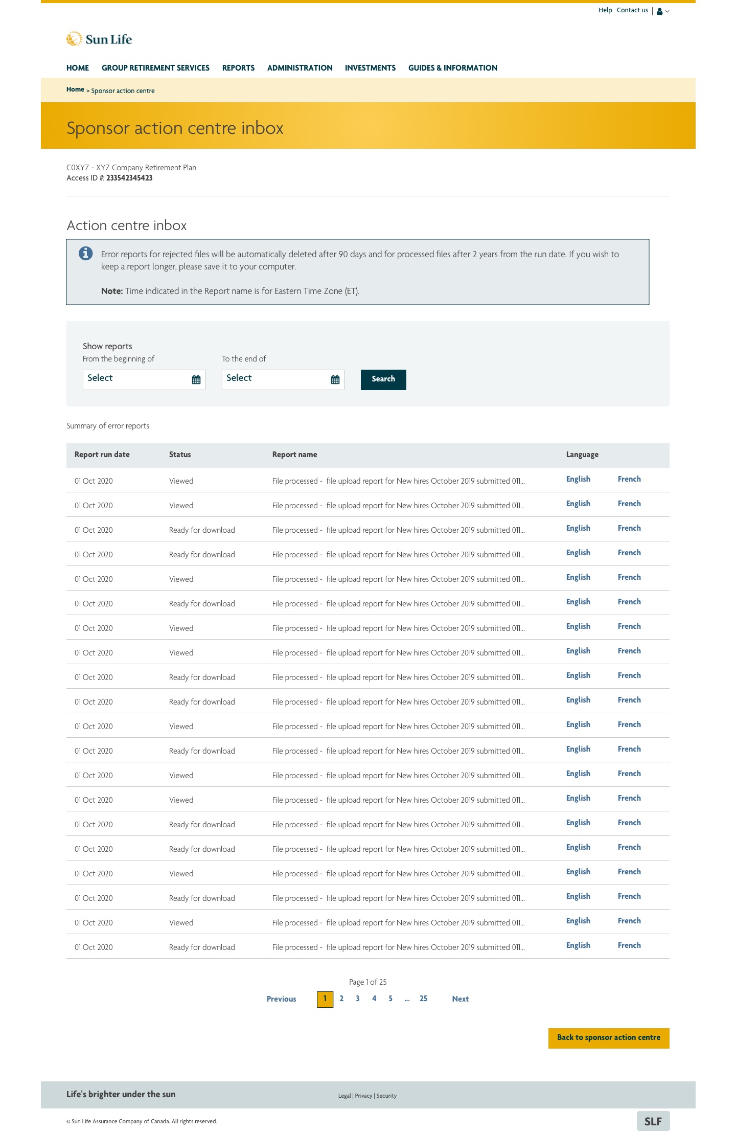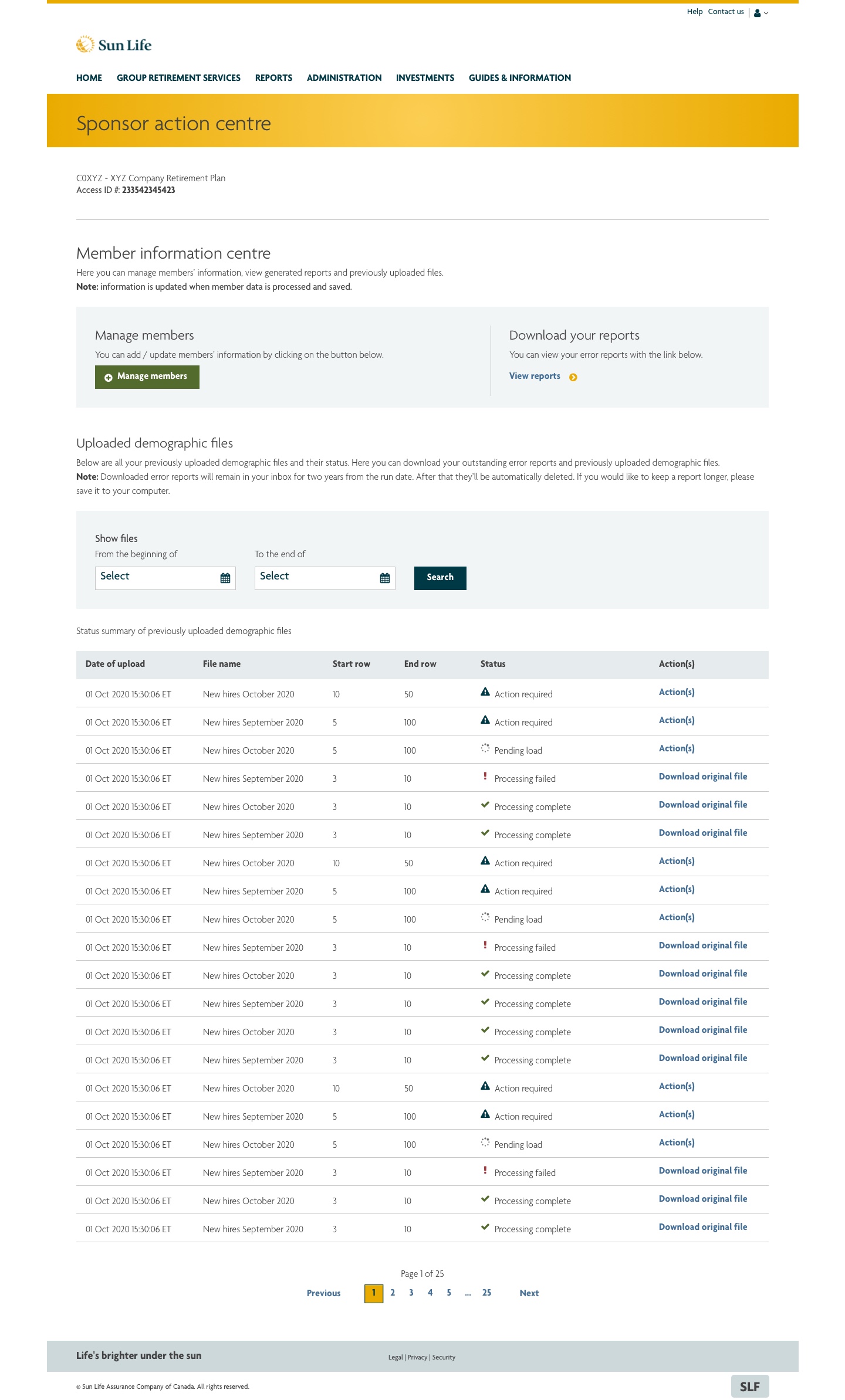 Sponsor action centre is a new additional part to the Upload demographic file tool designed and developed previously. It helps companies's HR representatives to identify the status of uploaded demographic files through the Upload demographic file functionality. It's also a place where the user can download error reports generated demographic files that uploaded to our backend system.